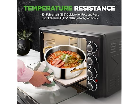 - BUILT TO LAST: Made with clad stainless steel and durable nylon, this non-stick set will surely prove its usefulness longevity for the long run. Pots and pans can handle a maximum heat temperature of 450° F, utensils Nylon tools up to 350° F. All are dishwasher safe.