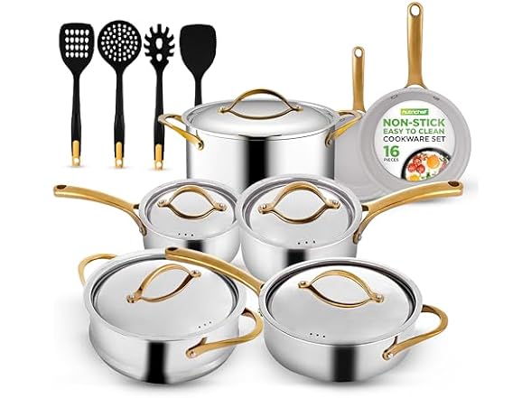 Introducing the NutriChef Kitchenware Pots & Pans Set, a 16-piece clad kitchen cookware collection that includes nylon utensils and a fry pan interior coated with durable ceramic non-stick coating. This set combines professional-grade functionality with stylish design, making it perfect for any home kitchen. It features multi-sized cooking pots with stainless steel lids, small and medium skillet fry pans, and a sauté pan with lid, providing versatility for all your cooking needs. The non-stick coating ensures easy food release and effortless cleaning, while the hollowed cast stainless steel handles with golden PVD coating add elegance. The cookware effectively distributes and retains heat for even cooking and is stain-resistant and dishwasher safe for convenience. The included heat-resistant kitchen tool utensils enhance safety and efficiency. This versatile set is compatible with gas, electric, ceramic, and induction cooktops, though the 1.5qt saucepan may not be suitable for induction. The set includes a 1.5qt saucepan pot with lid, a 3.0qt saucepan pot with lid, a 3.4qt sauté pan with lid, an 8qt stockpot with lid, a steamer insert with lid, an 8-inch fry pan, a 9.5-inch fry pan, a slotted spatula, a pasta server, a slotted ladle, and a turner. Constructed with 2.5mm clad stainless steel, this cookware can withstand temperatures up to 450°F for pots and pans and 350°F for nylon tools. The 0.6mm SS304 stainless steel lids, SS202 cast handles with PVD coating, and durable ceramic non-stick interior ensure longevity and performance. With sizes designed to fit any kitchen, the NutriChef Kitchenware Pots & Pans Set offers a premium cooking experience with both style and functionality.