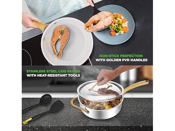 - NON-STICK COATING: The non-stick pot set cooking ware features a long-lasting nonstick coating for easy food release or tossing, cleaning & healthy cooking with heat resistant lacquer exterior making it resistant to high cooking temperatures.