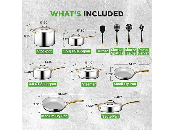 - STAINLESS STEEL 16-PIECE SET: This Pots & Pans set include 1.5qt & 3.0qt saucepan pot with lid, 3.4qt saucepan with lid, 8 qt stockpot with lid, steamer insert with lid, 8” & 9.5” fry pan, slotted spatula, pasta server, slotted ladle, and a turner.
