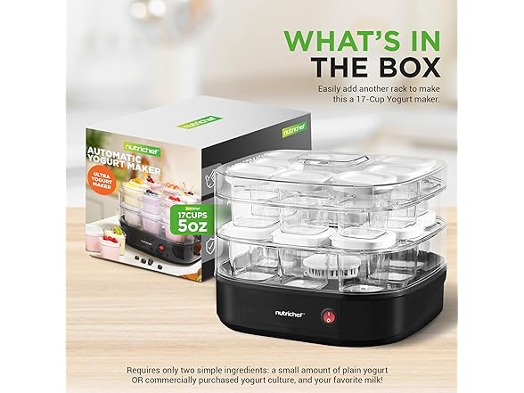 - INSTANT ORGANIZED STORAGE - Unbox convenience with 17 reusable 5 oz. yogurt cups and a dedicated yogurt rack provided by the Yogurt maker. The PS plastic construction guarantees durability, while airtight lids maintain freshness during fermentation.