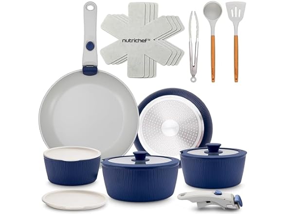 Introducing the NutriChef 18-Piece Stylish Kitchen Cookware Set — a premium ceramic cookware set designed to elevate your cooking experience. Crafted with a Teflon-free natural ceramic non-stick coating, this pot and pan set offers durable, long-lasting performance. The innovative detachable Bakelite handles provide cool-touch comfort and make storage easy, perfect for modern kitchens that value both style and efficiency. This non-stick pots and pans set includes multi-sized cooking pots with silicone-rimmed tempered glass lids and small to medium skillet fry pans, offering versatile options for every meal. The ceramic walls, measuring 2.5-3.0mm thick, effectively distribute and retain heat for even cooking all around. Each piece is compatible with gas, electric, ceramic stoves, ovens, and countertop cooktops, safe up to 536°F. Included heat-resistant kitchen utensils — a silicone turner, ladle, and tongs — complete the set for a convenient, all-in-one solution. With this elegant and functional pot and pan set non stick cookware, enjoy effortless cooking and easy cleanup while embracing a healthier, chemical-free kitchen. Perfect for home chefs seeking quality, convenience, and modern design in their ceramic cookware set.
