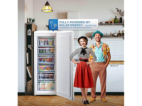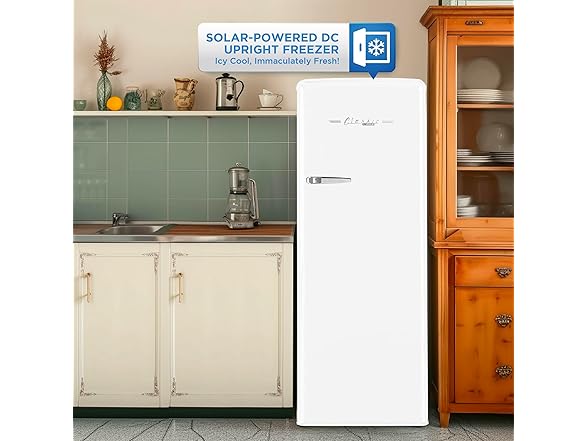 - Stylish Freezer: Elevate your off-grid living with this stylish upright retro freezer designed to store your extra food in style, powered exclusively by solar energy. A perfect blend of 1950s aesthetics fused with modern convenience.