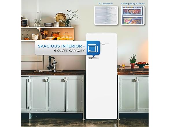 - Refrigerator with Efficient Storage: With the upright design, finding your frozen items has never been easier. The freezer boasts six heavy-duty drawers for ample storage, ensuring your items are neatly organized and easily accessible.