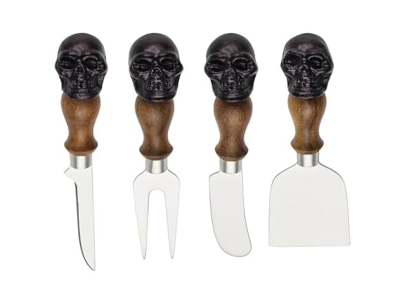 Oneida Serving Utensil Set, Skull Mirror Cheese Knives Flatware Set, Set of 4 Stainless Steel Utensils Set, Carved Wood Handles, Black Die Lacquer Finish, Halloween Decorations (4 Piece Cheese Knives)