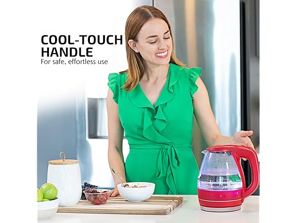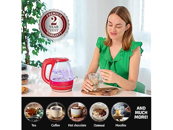 - ENJOY HOT WATER ANYTIME – This attractive glass electric kettle provides fresh, tasty water for making tea, oatmeal, hot chocolate, instant soup and coffee. Perfect for your home or kitchen, it operates on 1100W (120V) and boils a full 1.5L pot of water in just 7 minutes or less! It’s 50% more efficient than traditional stovetop kettles, helping you save on electricity while quickly enjoying your favorite hot drinks.