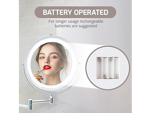 - CORDLESS & QUICK INSTALLATION – Experience true flexibility with this cordless makeup mirror powered by 4 AAA batteries (not included). Free from outlet restrictions, it installs easily on nearly any surface using just a few screws.