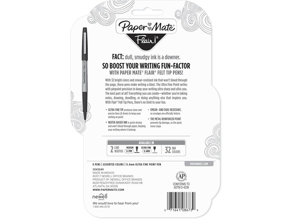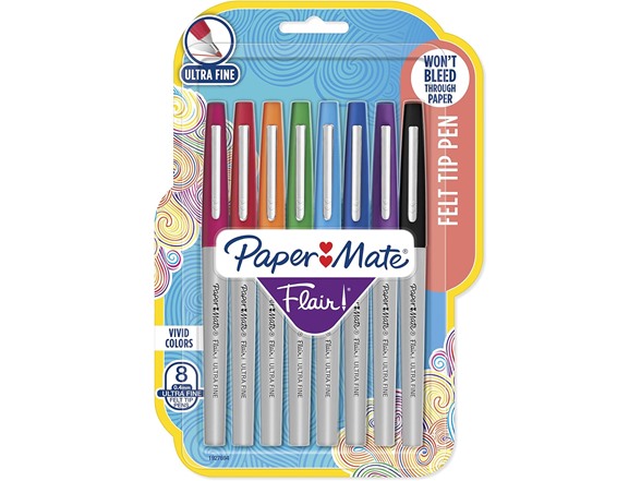 Paper Mate 62145 Flair Felt Tip Pens, Ultra Fine Point (0.4mm), Assorted Colors, 8 Count