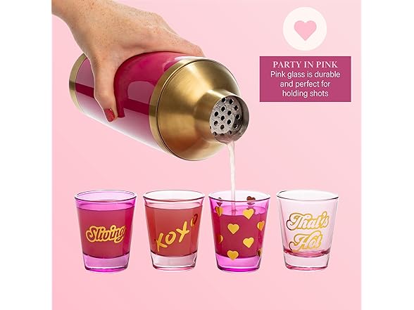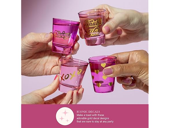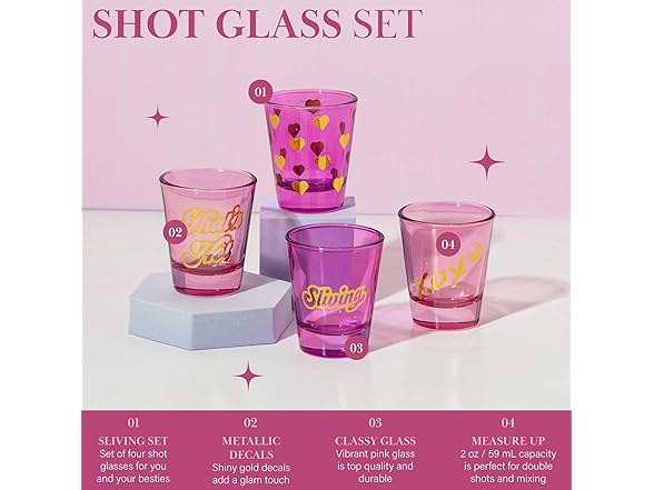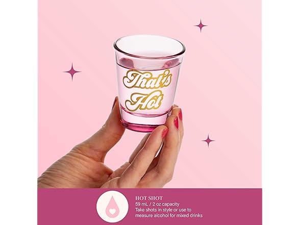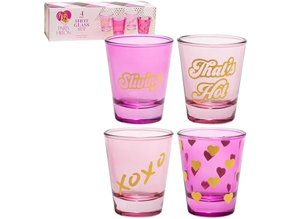 - A TOUCH OF PARIS SPARKLE: The hot pink and light pink finish on these shot glasses pair perfectly with the fun Paris Hilton sayings and designs, which shine bright in a gold metallic finish and are different on each glass.