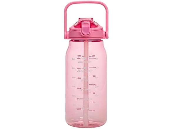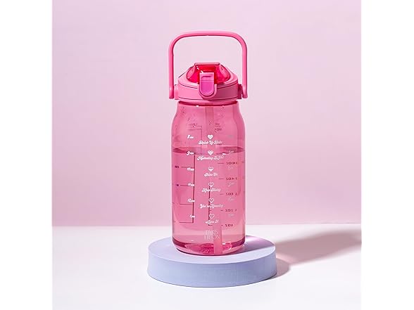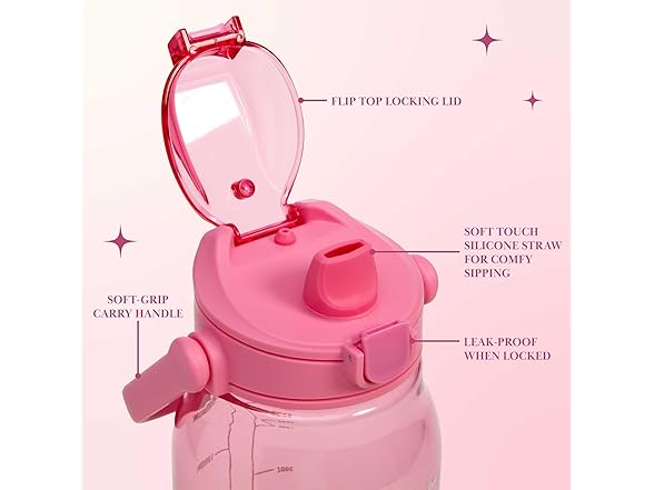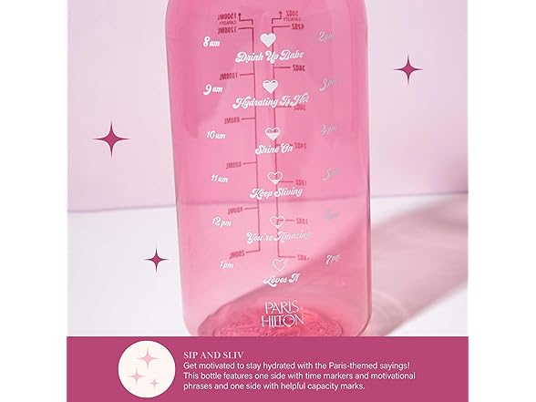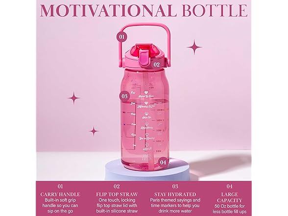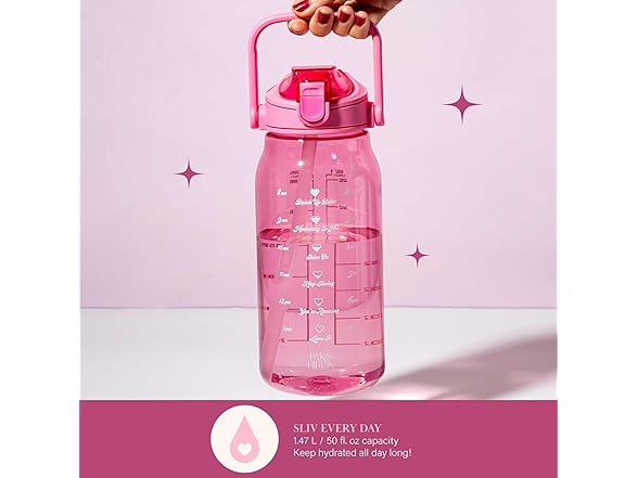 Paris Hilton Motivational Water Bottle with Straw and Leak-proof Flip-Top Lid, Motivational Time Markers, Carry Handle for Travel, Made without BPA, 50-Ounce, Pink