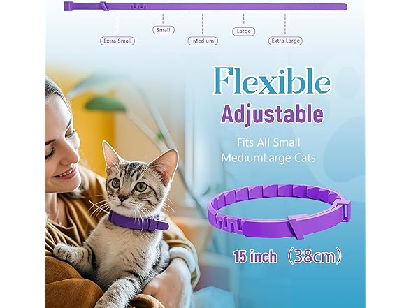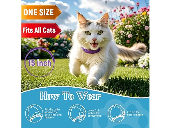 - [Adjustable for All Sizes] Measuring 15 inches, the cat collar is adjustable to fit kittens, adult cats, and large - breed cats and large breeds. You can trim the excess for a perfect fit, and the cat collar breakaway design ensures your pet's comfort as it grows. No scratchy edges or rough seams to cause discomfort.Calming cat collar is completely safe for your cat to wear.