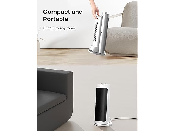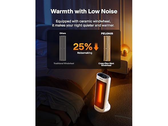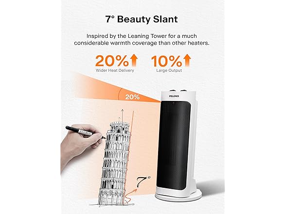 Model: PH-19J PELONIS Pisa Tower Portable Ceramic Space Heater, 1500W Fast Heating, Programmable Thermostat, Easy Control, Widespread Oscillation, Over Heating & Tip-over Switch Protection More Durable and Reliable Warmth from PELONIS PTC Tower Heater PTC ceramic heater delivers instant and directional warmth. Ideal for small to medium rooms, it heats up fast and delivers a wide range of heating elements. The PELONIS innovative and ultra-wide PTC energy-saving heating technology can distribute heat in large areas and with the ultra-high heating efficiency, it can improve the indoor temperature in a short time. The design inspiration of this PTC electric heater comes from the Leaning Tower of Pisa. The unique electric heater features: The Special design is on a full screen with 83 degrees that can increase the heat dissipation area by 20% more than other heaters, making it easier to feel the wrap around warmth. 3 seconds fast heating and over-heating protection. 2 heating levels: High (1500 Watts), Low (900 Watts) Over-heating protection and Tip-over switch protection Wide-angle oscillation, deliver warmth to a large scope (107 sq.ft) Easy control operation and easy to move and carry with carry handle design Product Specifications: Maximum Energy Usage: 1500 Watts Dimension: 7.72 (L) 7.72 (W) 17.76 (H) inch Gross Weight: 13.89 lb Max Noise: 52 dB Oscillating Angle: 70 degree Package including: 1 PTC Tower Heater 1 User manual Warm Prompt The warning on the package box was required by California Proposition 65. This PELONIS electric heater is ETL certificated and all the materials we used are safe.