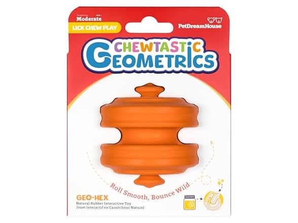 PetDreamHouse Chewtastic Geometrics Natural Rubber Enrichment Dog Toy Geo-Hex Orange, Engaging Rolling and Unpredictable Bounce, Fun to Lick, Play, Chew and Fetch
