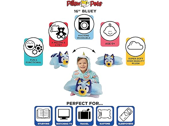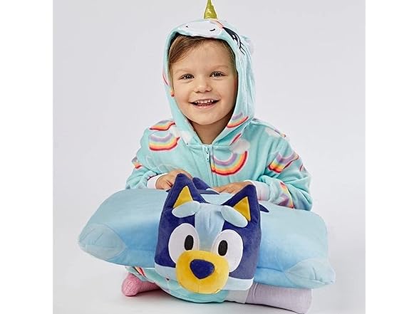 - GOOD ON ‘YA! Everyone’s favorite little blue puppy is now a Pillow Pet! Bluey loves to play and learn with her little sister and her best friends, and loves to tag along on magical adventures.