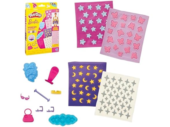 Make even more fabulous fashions with the Sparkles and Gems accessory pack! This arts and crafts kit is a perfect add-on purchase with any Play-Doh Barbie doll sets (sold separately). 4 Play-Doh Pattern sheets have fun colors and designs to help kids make Barbie clothes with Play-Doh compound. Customize and accessorize each look with things like sandals, a purse, sunglasses, and Play-Doh gems. Looking for Barbie gifts for 5 year olds and up? This Play-Doh set is the perfect way to spark imagination and inspire kids arts and crafts activities! Copyright Mattel. PLAY-DOH and HASBRO and all related trademarks and logos are trademarks of Hasbro, Inc.