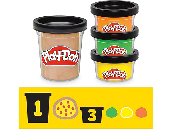 - 4 PLAY-DOH CANS INCLUDING PIZZA DESIGN: A 2 ounce can of Play-Doh modeling compound features a cool pizza design and colors. Also includes 1 ounce cans of orange, green, and yellow (contains wheat)