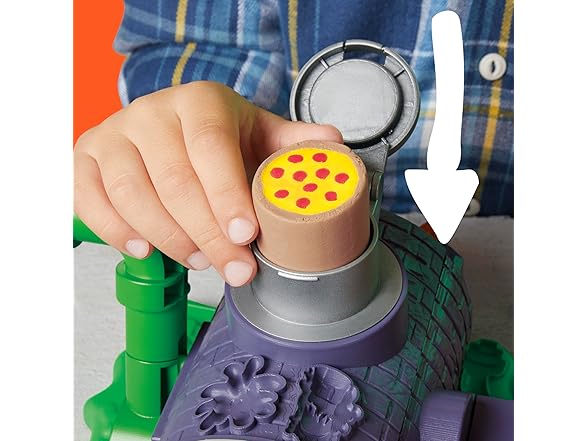 - FILL, SLICE, AND LAUNCH: Add Play-Doh compound inside the Teenage Mutant Ninja Turtles playset, pull the handle to slice it into Play-Doh pizza shapes, then press the button in the back to launch