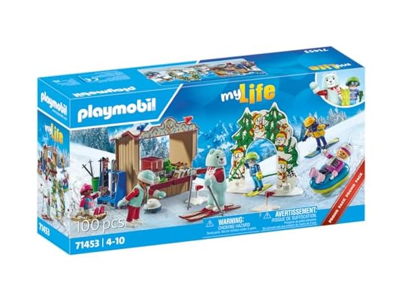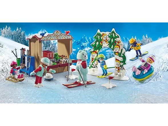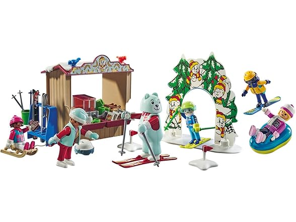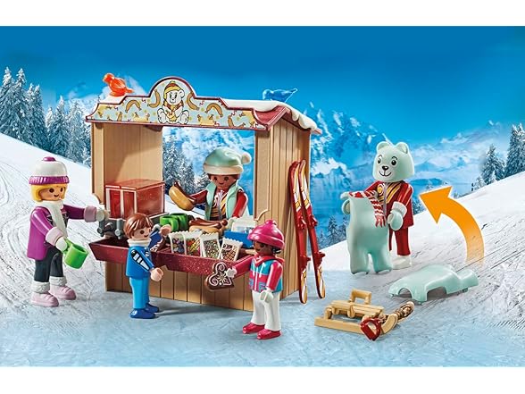 - This detailed PLAYMOBIL set includes 6 PLAYMOBIL figures, skis, sleds, a bobsled, and a snowboard, as well as a snack booth for refuelling and other fantastic extras.