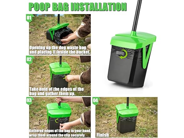 - Easy & Sanitary Clean-Up with Poop Bags. With our 100 bags and clip, setup is a breeze in just seconds: ①Opening up the dog waste bag and placing it inside the bucket. ②Take hold of the edges of the bag and gather them up.③ Gathered edges of the bag in your hand, wrap them around the clip securely.