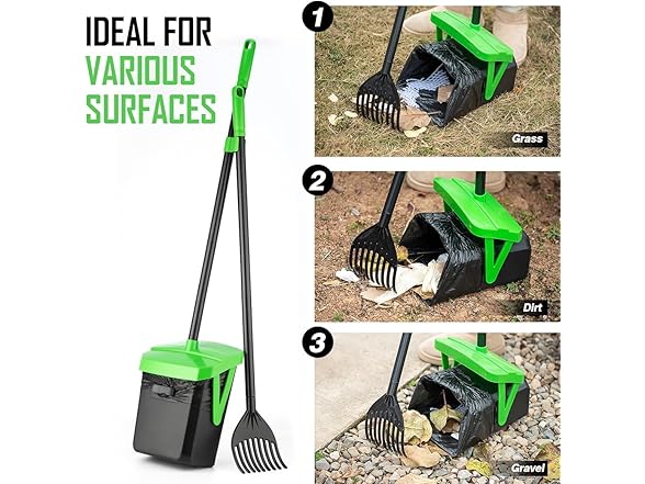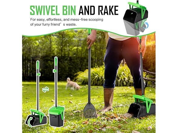 - Convenient Swivel Bin and Rake Design - Our swivel bin and rake are crafted with your convenience in mind, for easy and efficient scooping of pet waste. Bid farewell to those tiresome moments of bending over and fumbling to scoop up your furry pal's little accidents. The specially engineered swivel bin allows for a smooth and efficient scooping motion, making the task quick and effortless.