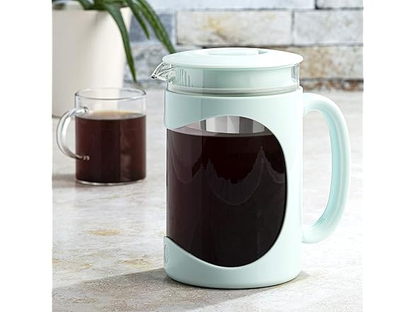 The Primula Burke Cold Brew Coffee Maker allows you to make smooth, craft coffee from the convenience of your own home. The Burke features a durable temperature-safe glass carafe with secure-grip plastic caging made without BPA. It fits in most refrigerator doors. The Burke also comes with a removable fine-mesh filter and a tight-sealing lid. It produces up to 6 cups of smooth, flavorful cold brew coffee that is 65% less acidic than traditional hot brewed coffee. To use, simply add coarse ground coffee or coffee bags to the filter, pour water over the coffee, and let it steep in the refrigerator overnight or desired strength. When it's ready, remove the filter, replace the lid, and serve. Pour over ice, add milk, creamer, syrups, or flavorings to fit your taste preferences. Ideal for making iced coffee, lattes, iced tea, and more. Brew, serve, and store all in the same cold brew pitcher. It keeps your brew fresh for up to 14 days when stored in the fridge and it's designed to fit most fridge doors. Be your own barista and enjoy delicious cold brew coffee at home with a Primula cold brew coffee maker!