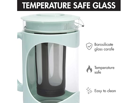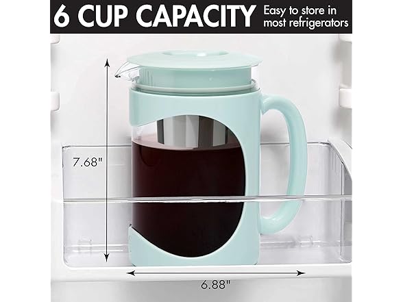 - HASSLE-FREE COLD BREW- Designed to make cold brewing easy and mess-free. Easy to use, dishwasher safe, effortless cleanup, durable glass construction, removable filter, and fits most refrigerator doors or shelves. Makes up to 6 cups (52 ounces) of smooth, delicious cold brew coffee.