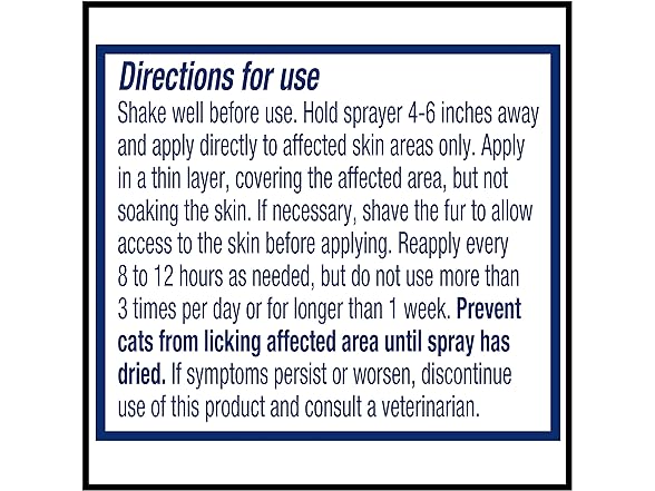 Shake well before use. Hold spray 4-6 inches away and apply directly to affected skin areas only. Apply in a thin layer, covering the affected area, but not soaking the skin. Do not use more than 3 times per day or for longer than 1 week. Prevent cat from licking affected area until spray has dried.