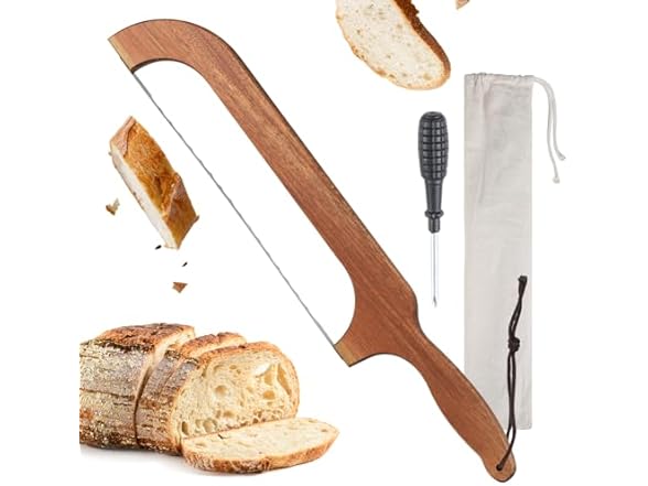 - Serrated Blade for Perfect Loaves: Meet your sourdough Bread Knife—the Serrated Bread Knife that slices through sourdough's toughest crusts like sunlight through clouds. Our Bread Bow Knife design preserves every air pocket in Homemade Bread, with a blade curvature perfected by artisan bakers. From dense rye to walnut-studded loaves, this Sourdough Bread Knife for Homemade Bread delivers deli-worthy precision with every stroke