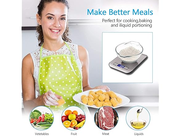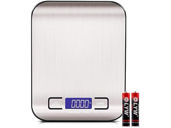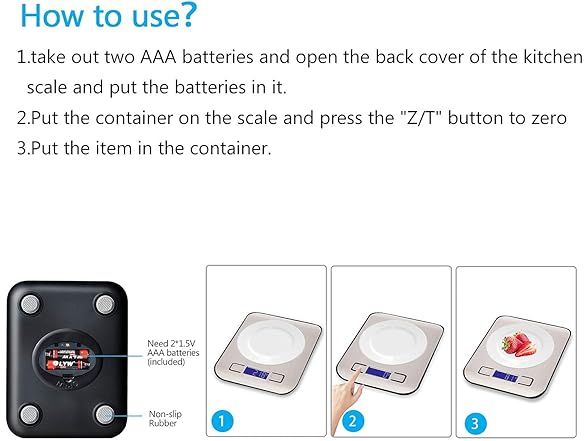 Kitchen Scale for Baking and Cooking This scale features a handy tare function to easily measure ingredients in a dish, allowing you to cut down on prep time. Designed with a smooth stainless steel platform for easy cleaning and maintenance, this scale's slim design makes it easy to store while maintaining the durability to withstand up to 11 pounds of weight. Whether you're a beginner or a seasoned chef, this digital scale has the simplicity and practicality to create the perfect kitchen creations. Measuring Suggestion: Place the item on the center of weighing platform. The minimum weight recommendation is 3g-5g. Kindly note that this scale is not water-resistant. AAA battery color random Measure range:1g/0.1oz-5kg/11lbs.