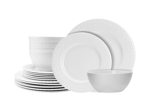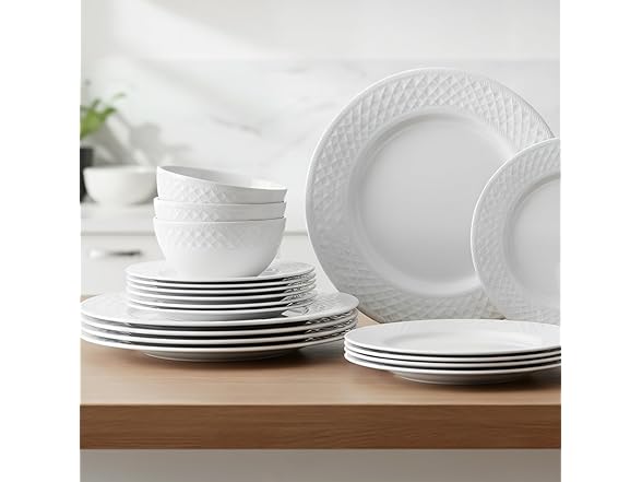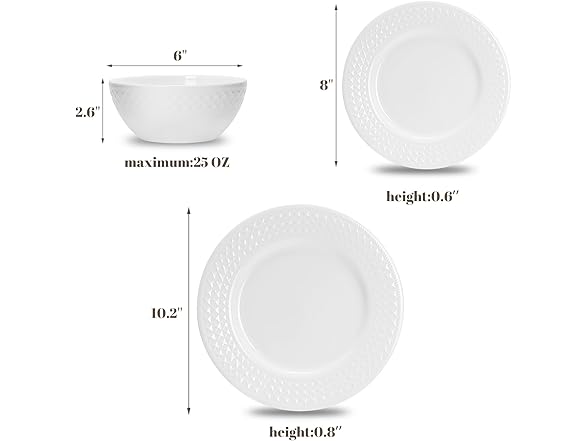 - PREMIUM BONE CHINA - LIGHTWEIGHT, DURABLE & LUXURIOUS Crafted from high-grade bone china with a beautiful translucent luster that catches the light.White embossed dinnerware set Up to 30% lighter than traditional porcelain, making handling effortless. Chip-resistant construction withstands daily use while maintaining its elegant appearance. Combines restaurant-quality durability with luxury aesthetics for both everyday meals and special celebrations.