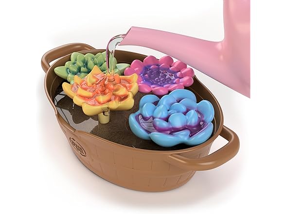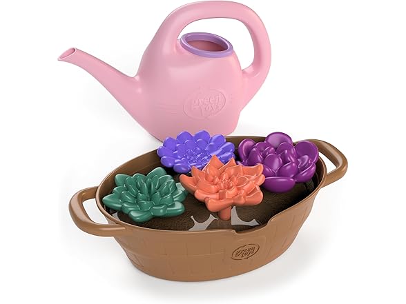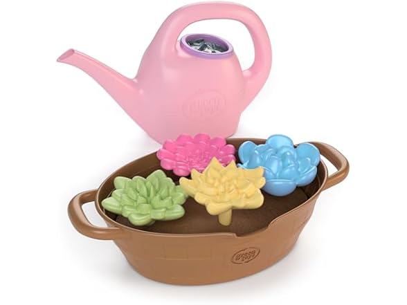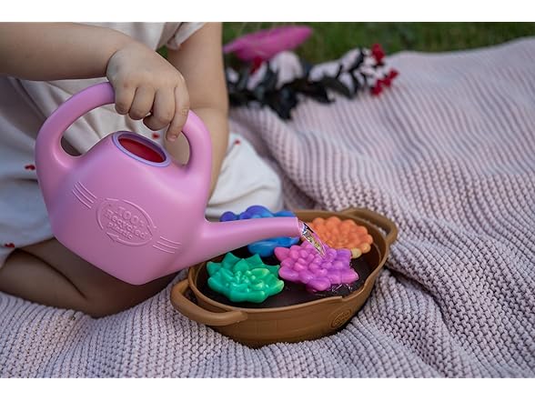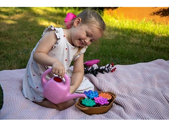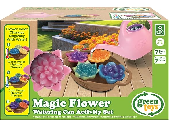 Spark your little gardener's imagination with the Green Toys Rainbow Bloom Watering Can Activity Set! The set includes a basket, lifelike insert, lightweight watering can that is perfect for small hands, plus special succulents and flowers that change color with cold water, adding an exciting twist to every watering session. Made from 100% recycled plastic. Foster a love for nature and outdoor exploration with the Rainbow Bloom Watering Can Activity Set—where every watering session sparks adventure and surprises!