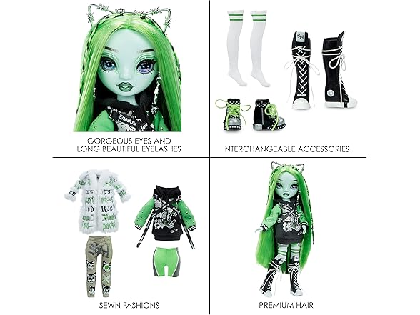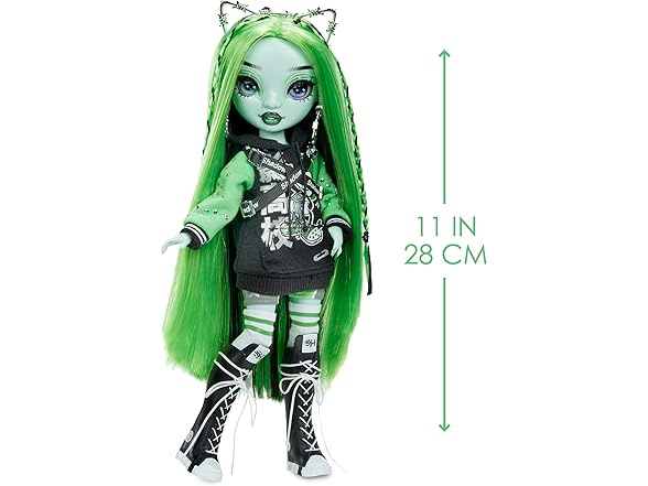 - GORGEOUS FEATURES: Harley has a unique design and is dressed in neon green and black from head to toe. She has gorgeous, detailed features in her fashion, beautiful straight green hair with two thin braids, muted skin tone with neon green accents, long real eye lashes and glass eyes. Collect the Rainbow of all the Rainbow Vision- Neon Shadow fashion dolls.