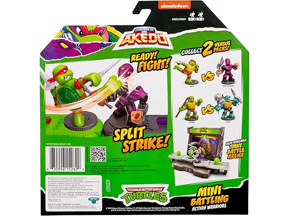 Get ready for an epic showdown on the streets of New York as the new TMNT mini warriors engage in battle against their most formidable foes! Brace yourself for heightened intensity with the arrival of the EPIC villain, Foot Soldier, armed with a lethal sword, and the iconic hero, Raphael, renowned for his swift and powerful high kicks. As chaos looms with Foot Soldier's presence, Raphael stands ready to defend the city against the looming threat. Watch as the epic showdown between the forces of evil unfolds, with Raphael aiming to prevent Foot Soldier from causing CHAOS! Who will emerge victorious? With an array of captivating characters to collect, including the iconic Raphael and his villainous foe, Foot Soldier, your child will be fully immersed in the exhilarating world of battling! Will your child harness Raphael's high-kicking prowess to defend against Foot Soldier's attack? Gear up for action as your child unleashes the spirit of battle to safeguard the city from the clutches of evil with the Legends of Akedo TMNT Versus Packs. Are you ready to join the fight? Let the battle commence! Ready, Fight, Split Strike!