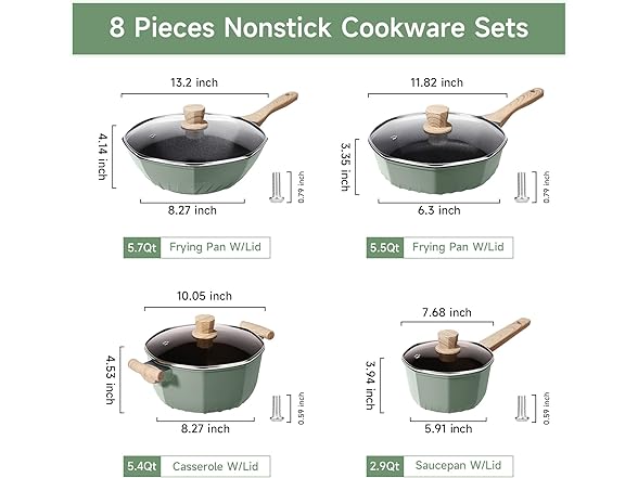 - 8-Piece Induction Cookware: Our non-stick pots and pans set includes a 13.2” frying pan with a tempered glass lid, an 11.82” frying pan set with a tempered glass lid, a 5.4-quart casserole pot with a tempered glass lid, and a 2.9-quart saucepan pot set with a tempered glass lid. Suitable for electric stovetops, gas, induction, halogen, furnaces, and almost all types of stovetops.