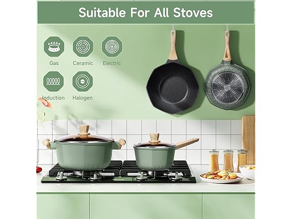 - Stay Cool Handle & Glass Lid: The bakelite handle of this kitchen pots and pans set provides a stable and comfortable grip, with heat-resistant properties to ensure you don't have to worry about burning your fingers when handling the nonstick cookware set. The ergonomic design of the tempered glass lid allows you to monitor the cooking process easily and prevents splashes on your stove.
