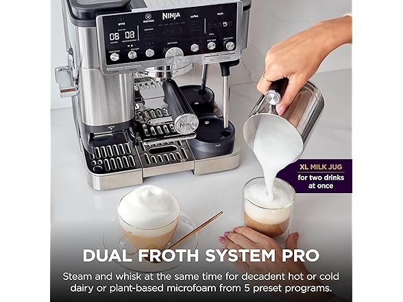 - DUAL FROTH SYSTEM PRO: Unlock more froth options with the easy-to-clean, insulated steam wand and XL Milk Jug. Elevate your at-home coffee routine and create froth for two drinks with 5 preset froth functions including steamed milk, thin froth, thick froth, extra-thick froth, and cold foam.