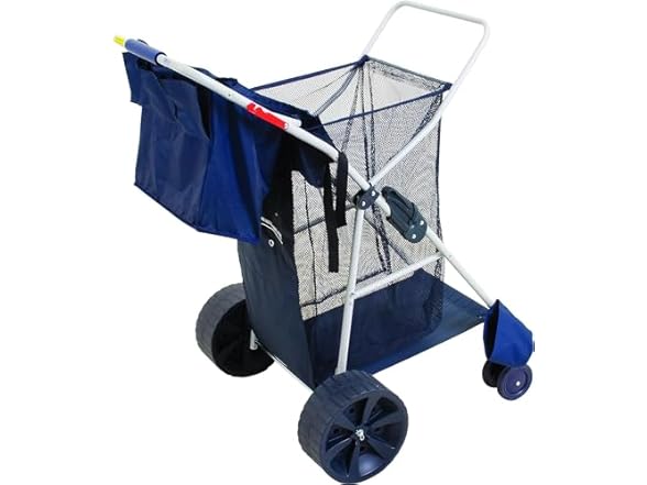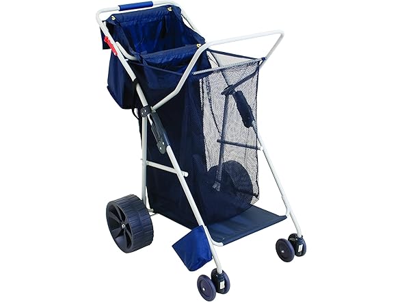 - PREMIUM BEACH CART: Features a large mesh storage pouch, perfect for storing beach towels, beach toys, sunblock, and more. Insulated beverage compartment keeps drinks and snacks cold