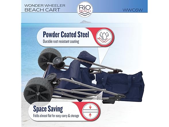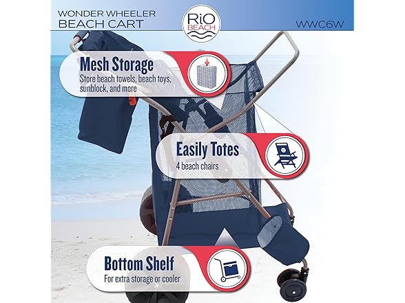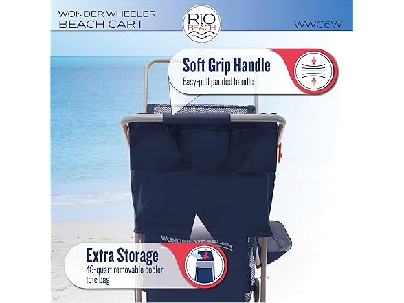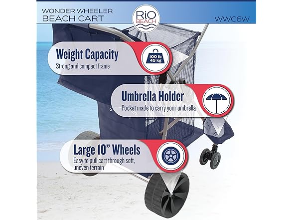 The Deluxe Wide Wheel Beach Cart has a weight capacity of 100 lbs. and can hold a 48 quart cooler and 4 beach chairs. The main storage compartment is 15 cubic feet and there is a rear storage pocket measuring 11 3/4" x 14". Includes an umbrella holder, a bodyboard holder and removable tote bag. The Wonder Wheeler has plenty of room for all your beach gear. Load up a Wonder Wheeler today and enjoy a day at the beach.Deluxe Wide Wheel Ultra Wonder Wheeler Beach Cart is 20% larger than the original Wonder Wheeler beach cart. With 4" ultra wide rear wheels, the Wonder Wheeler Beach Cart makes it easier than ever to transport your beach gear over all types of terrain - sand, gravel, grass, pavement. And with the wide 10" diameter rear wheels, 4 1/2" pivoting front wheels and neoprene handle, the Ultra Wonder Wheeler is easy to maneuver. The wonder wheeler is designer to pull rather then push for best performance. Easy to assemble, all you need is to clip in the wheels.