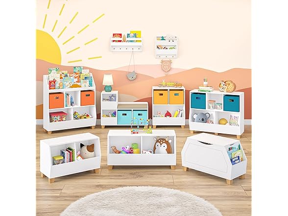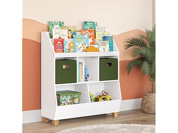 - IMPROVED ORGANIZATION AND LIVING: This playroom storage solution features 3 cubbies, 2 lower compartments, and a 3-slot book nook on top. It's an excellent toy organizer and storage unit to declutter any nursery or bookshelf.