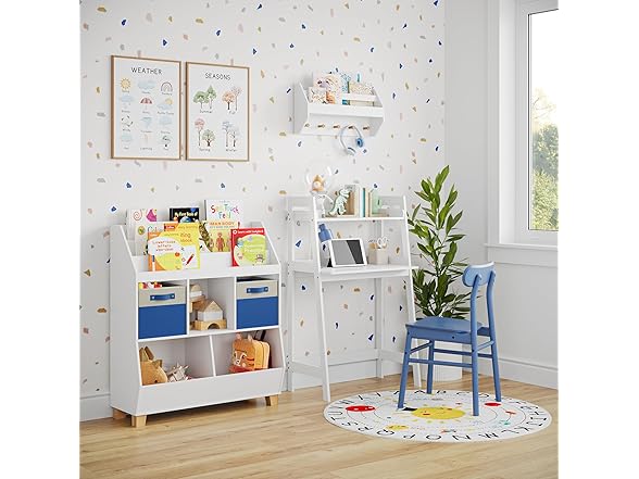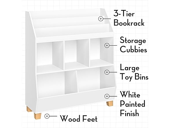 - MODERN APPEAL: With a clean white finish and solid pine wood legs, this kids' bookshelf and toy storage unit adds a contemporary yet versatile look to any playroom. Its functional style fits many decor schemes.
