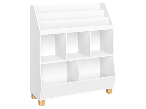 Keep Clutter at Bay Our RiverRidge Kids Catch-All Multi 35in Toy Organizer with Bookrack is the ideal solution for book storage for kids. With three square cubbies, two spacious lower compartments, and a three-slot bookrack, it creates an excellent "catch-all" spot for organizing toys, stuffed animals, books, and more. The bookrack is well-suited for storing activity books, coloring books, and bedtime stories within easy reach. Stylish and Sturdy Featuring a clean, white painted finish, four solid pine wood legs, and a middle support leg for added stability, our kids' book storage organizer combines functionality with contemporary style. At just under 40" high, it's the ideal size for children, and it secures to the wall for added safety. Pair it with our RiverRidge folding fabric storage bins to conceal clutter with a pop of color (bins sold separately). Dimensions and Details Our RiverRidge Kids Catch-All Multi 35in Toy Organizer with Bookrack measures 35" W x 13.37" D x 39.67" H and weighs 45.05 lbs. It can hold up to 115 lbs, making it a durable and practical choice for organizing your child's playroom or bedroom. With detailed instructions and wall-anchoring hardware included, assembly and installation are a breeze. -Three square cubbies and two spacious storage compartments -Three-slot bookrack for activity books, coloring books, and bedtime stories -Clean, white painted finish with solid pine wood legs and a middle support leg -Ideal size for children under 40 inches with wall-anchoring hardware for safety -Pair with our RiverRidge folding fabric storage bins (sold separately) for added organization and pops of color for your space Dimensions (Overall): 35 Inches (W) x 13.37 Inches (D) x 39.67 Inches (H) Weight: 45.05 Pounds Holds up to: 115 Pounds