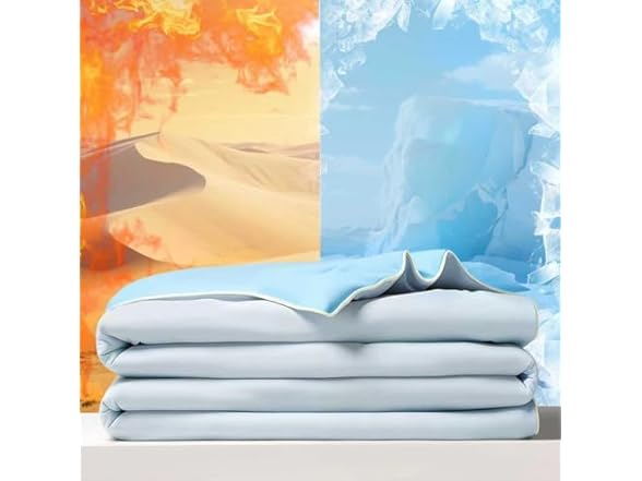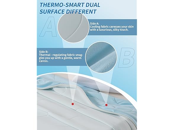 - 【Dual-Sided Hot & Cold Comforter】 Experience Year-round Comfort with our innovative Temperature-regulating Blanket! Featuring instant Cooling and Warmth adjustment, Simply Flip Between Hot and Cold Sides to Suit Your needs. The Advanced Fabric provides Perfect Temperature Control for Hot Sleepers while Remaining Gentle on Sensitive Skin. Ideal for Maintaining Comfort in High-hygiene environments, this Versatile Blanket Transitions Seamlessly from Summer to Autumn Use.