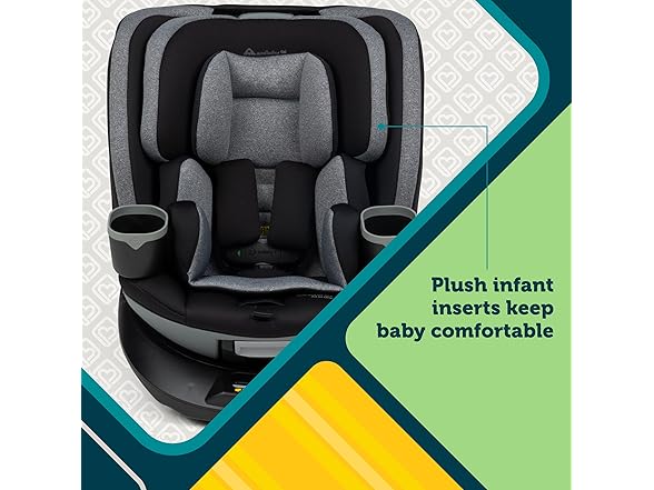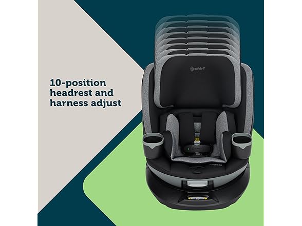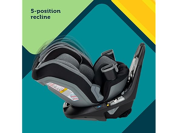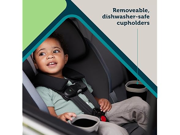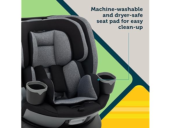 - MORE FEATURES TO LOVE Car seat 360 rotation. 10-position headrest and harness adjust for every stage. 5-position recline. Plush infant inserts and premium fabrics. Machine-washable, dryer-safe seat pad. 2 dishwasher-safe cup holders.