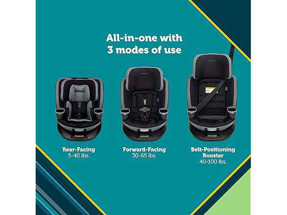 - EVERY AGE AND STAGE Rotating car seat 360 has soft locks to keep the seat secure when buckling in all 3 modes, birth to 10 yrs: rear-facing (5–40 lbs., 19"–40"), forward-facing (30–65 lbs., 34.4"–49"), and belt-positioning booster (40–100 lbs., 43.4"–52").