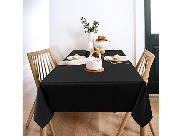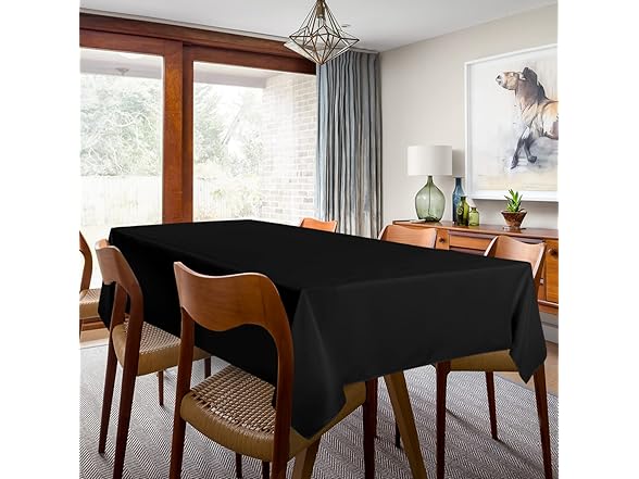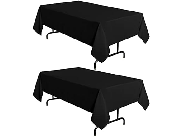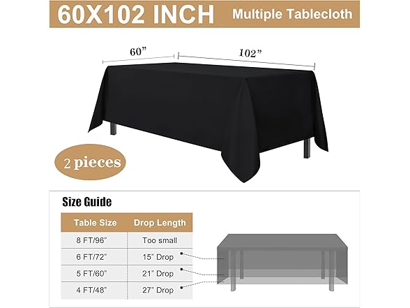 - MEASUREMENTS: This black table cloth is measured 60 inch wide and 102 inch long. Perfect for standard 6ft table, provide 15 inch drop for 6ft tables.