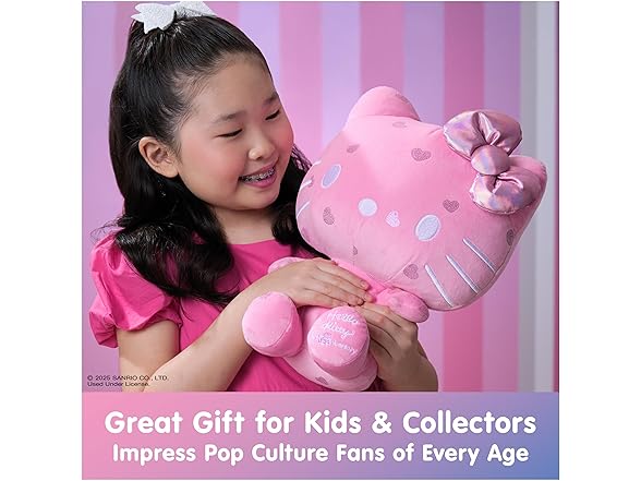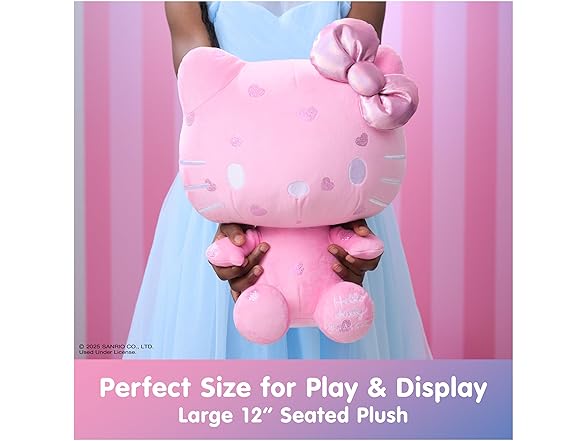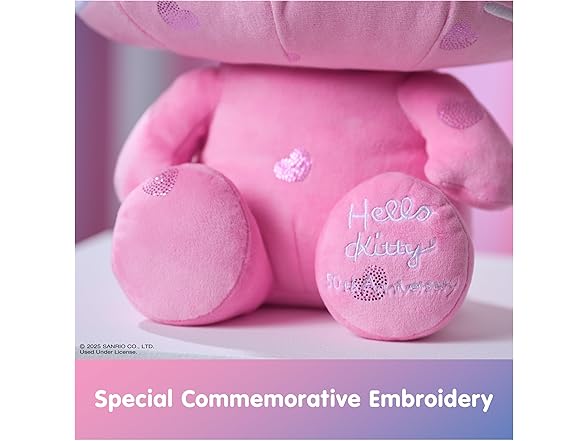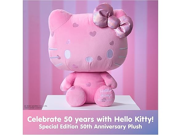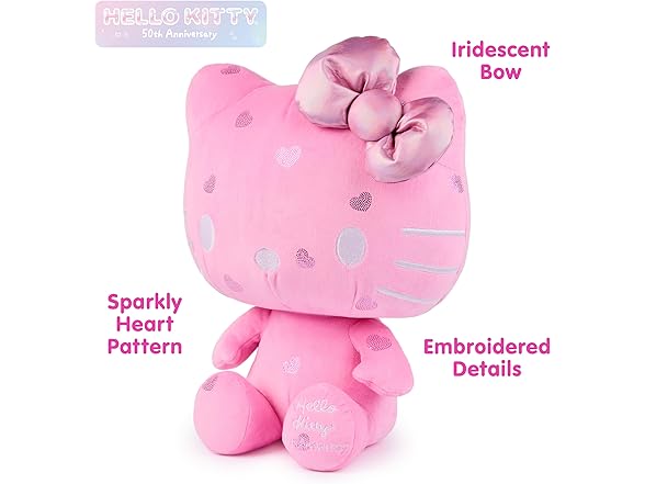 - HELLO KITTY 50th ANNIVERSARY PLUSH: Celebrate 50 years of Hello Kitty This special edition 12” plush features soft bubblegum-pink plush dotted with sparkly hearts, a pink iridescent bow, silver facial details, and special commemorative embroidery