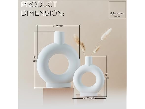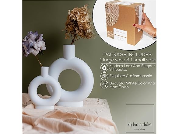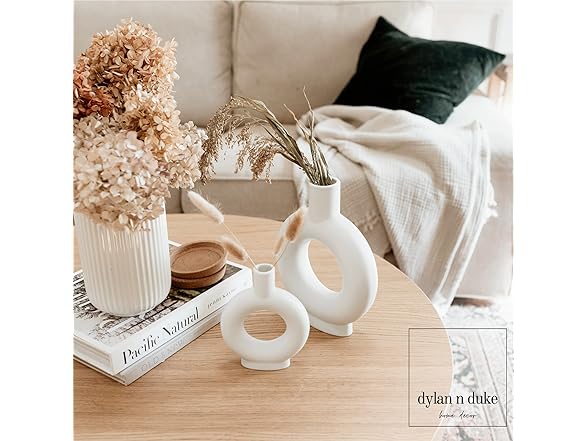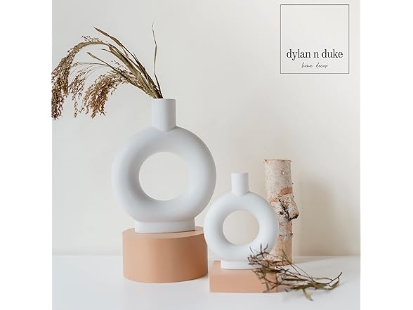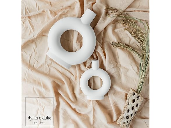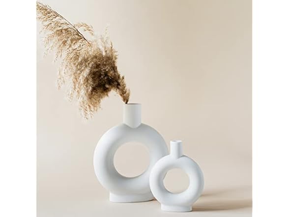 - [MODERN LOOK AND ELEGANT SILHOUETTE] Our Nordic-inspired ceramic vase set adds a simple and beautiful contemporary accent to every interior. The clean lines and curving silhouette combined with the unglazed matte surface give a minimalist artistic feel to any space. The natural beauty of the white matte finish and the texture provide for a rooted earthy feel. Circle donut shaped vase is unique and makes a statement all on its own ESPECIALLY when it's a set of 2!