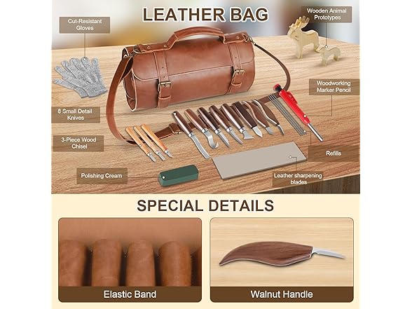 - 【WOOD CARVING KIT ENORMOUS DELUXE EDITIONG: This Woodcarving Knife Set Includes 15 Sharpening Tools, A Pair Of Cut-Resistant Gloves, A polish, And A Holster For Storing Your Tools. The Perfect Sharpening Set For Professionals And Wood Carvers To Easily Carve A Variety Of Wood Crafts!