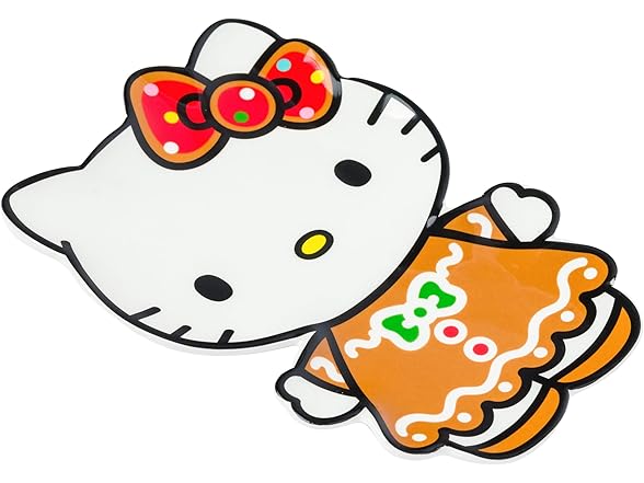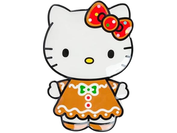 - HELLO KITTY HOLIDAYS: Celebrate the holidays with this trinket tray in the shape of Hello Kitty. Trinket tray features Hello Kitty in a gingerbread outfit with an adorable candy bow.