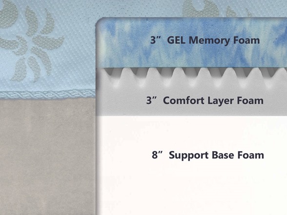 - Mattress Build Up: 3" Gel Memory Foam, 3" Air Comfort Foam, 8" Supportive Base Foam